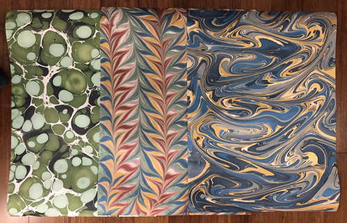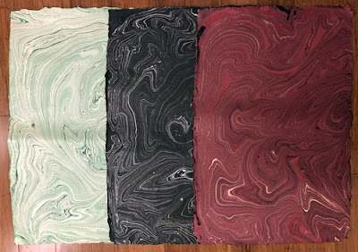 My fixation on finding The Perfect Green Marbled Paper came to an end only when I went out and bought a marbling kit. I don't want to make the paper myself, but somehow without having the kit I couldn't accept these beautiful-but-not-quite-what-I-imagined papers as good enough. Now that I could make something closer to my imagination, I think they're probably fine.